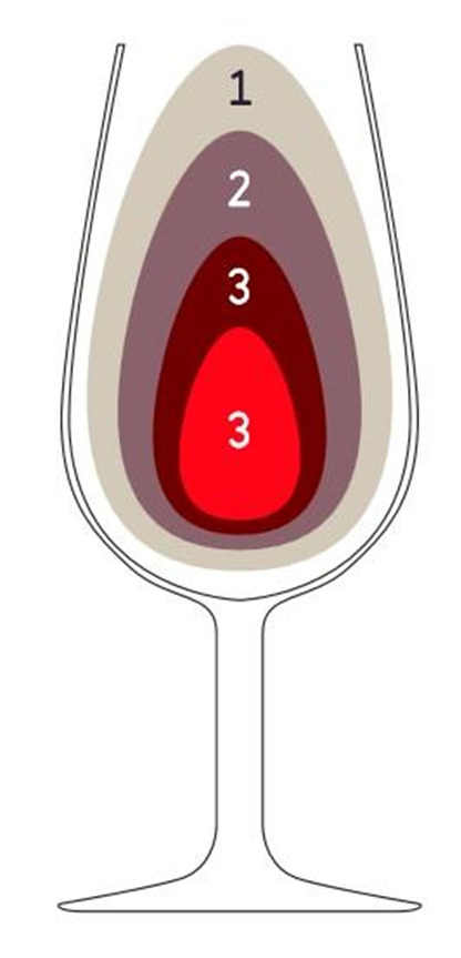 La jerarquía suele ser de la zona 1 donde se representan los reflejos en la zona exterior a la zona 3, la capa propiamente dicha, siendo la zona 2 de transición inapreciable en la mayoría de los vinos.