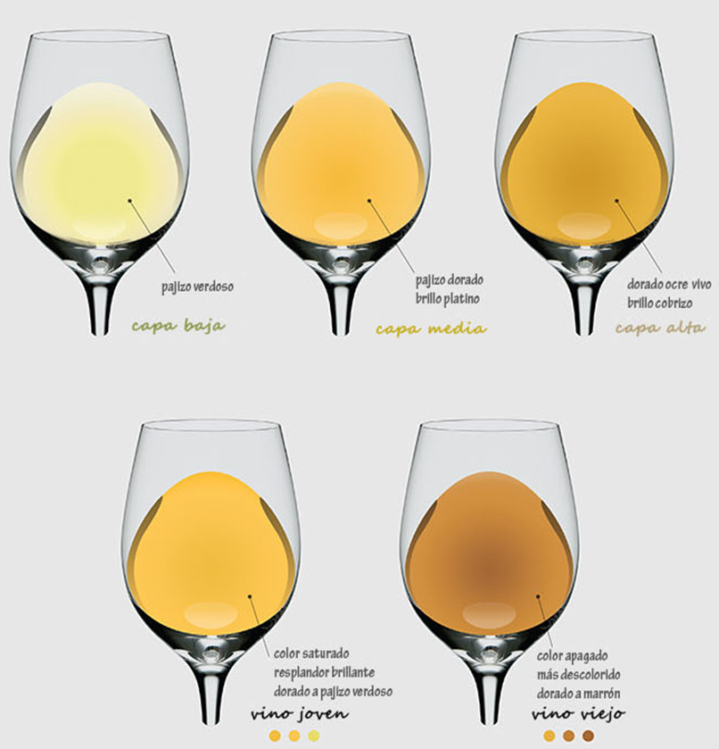 Vinos blancos: amarillos tenues y transparentes en su juventud, luego pasan a tonos dorados y terminan en ocre y ámbar.