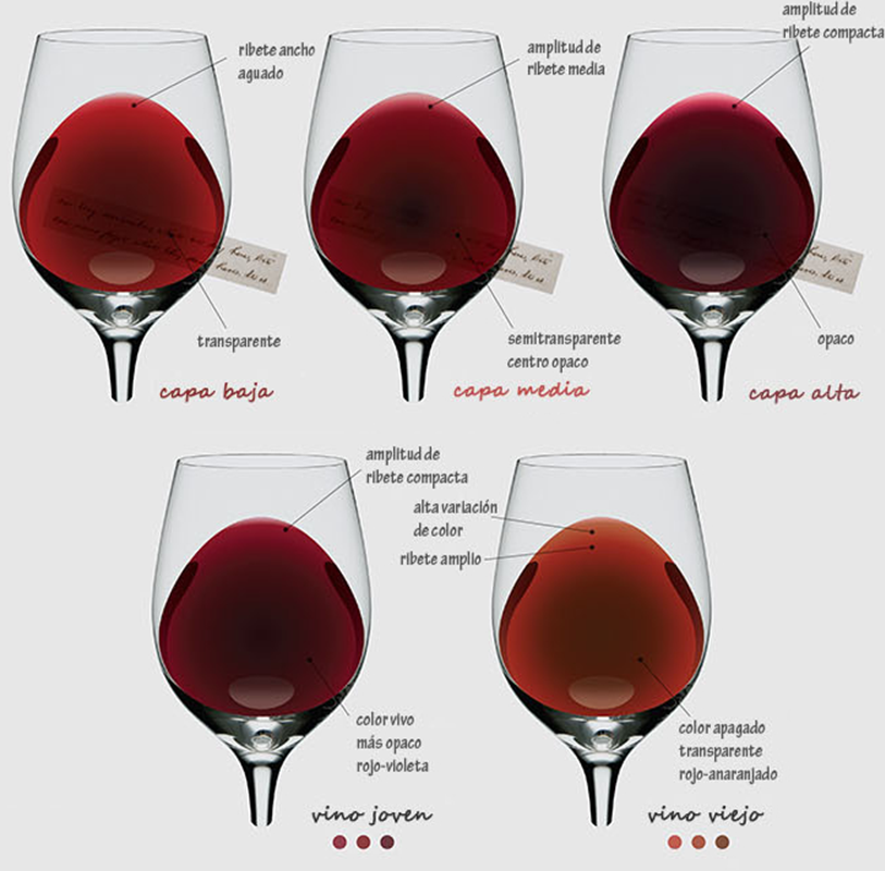 En la cata, cuando tumbamos la copa en posición de pico de flauta sobre fondo blanco, se encuentran zonas de color diferenciadas según el espesor de líquido en la copa.