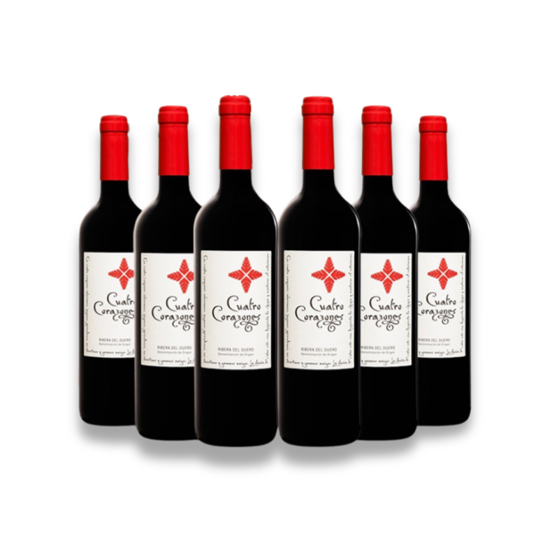 Pack de 6 botellas Cuatro Corazones de Ribera del Duero, 100% variedad «Tempranillo». Un vino actual que combina sentimientos, intensas experiencias y pasión por el vino. Un Roble 2021, con 5 meses en barrica, ideal para regalar.